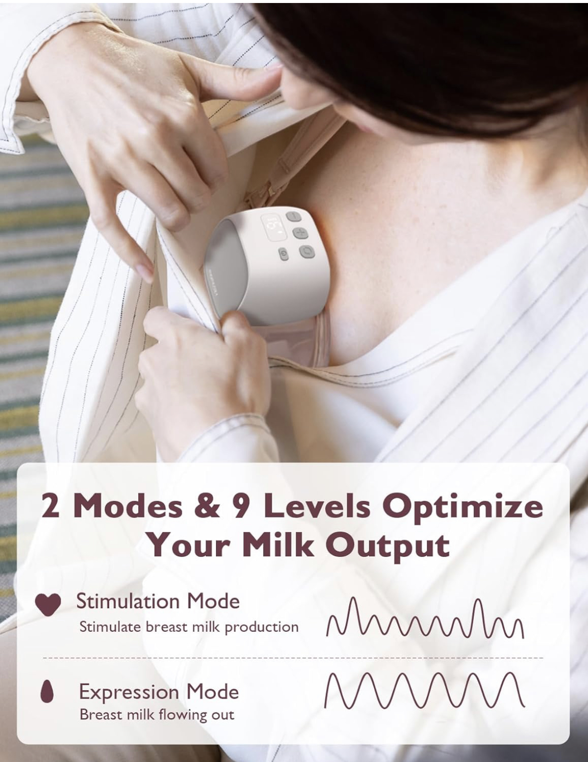 - Less Time, More Milk – Momcozy S9 Pro Updated wearable breast pump with 2 modes & 9 levels. Imitating the baby’s suckling method to optimize milk production. Ensure that each mother produces more milk in a shorter time, and give moms more choices and comfort.